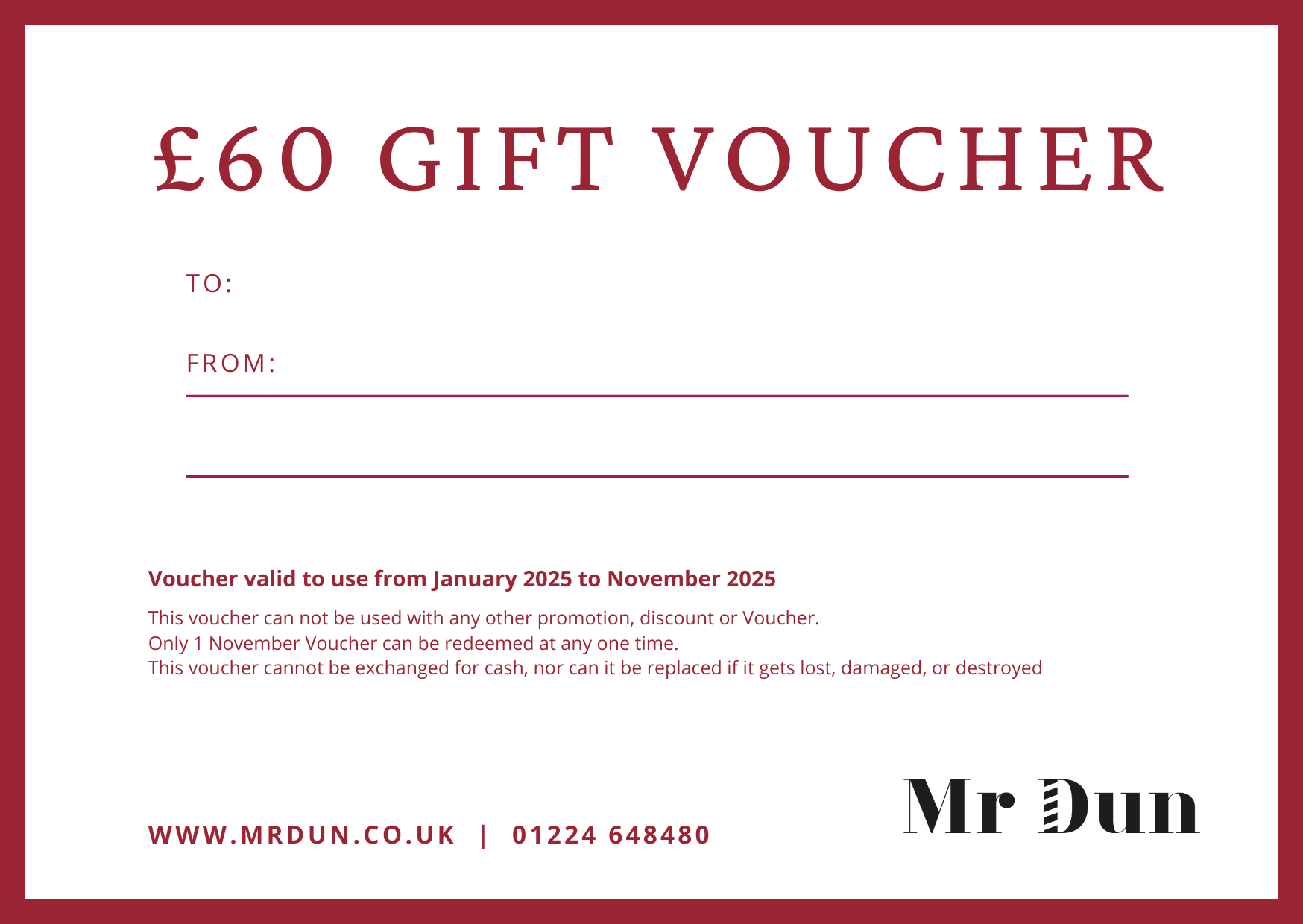* This voucher can only be redeemed from January 2025 to November 2025 in all 3 Mr Dun Locations - Belmont, Inverurie or Bieldside.ย